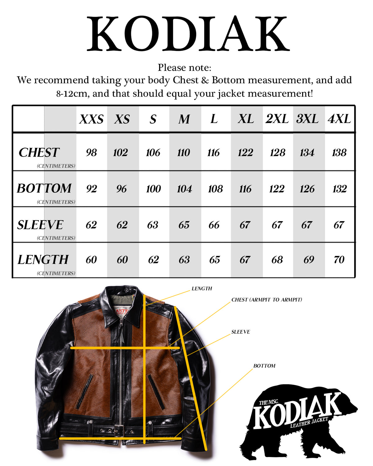 The hair-on cowhide panels are a natural material and will vary from jacket to jacket. Expect organic differences in shade, pattern, and texture, ranging from lighter to darker brown tones. These variations are part of the character of the hide and ensure that each Kodiak is truly one of a kind.