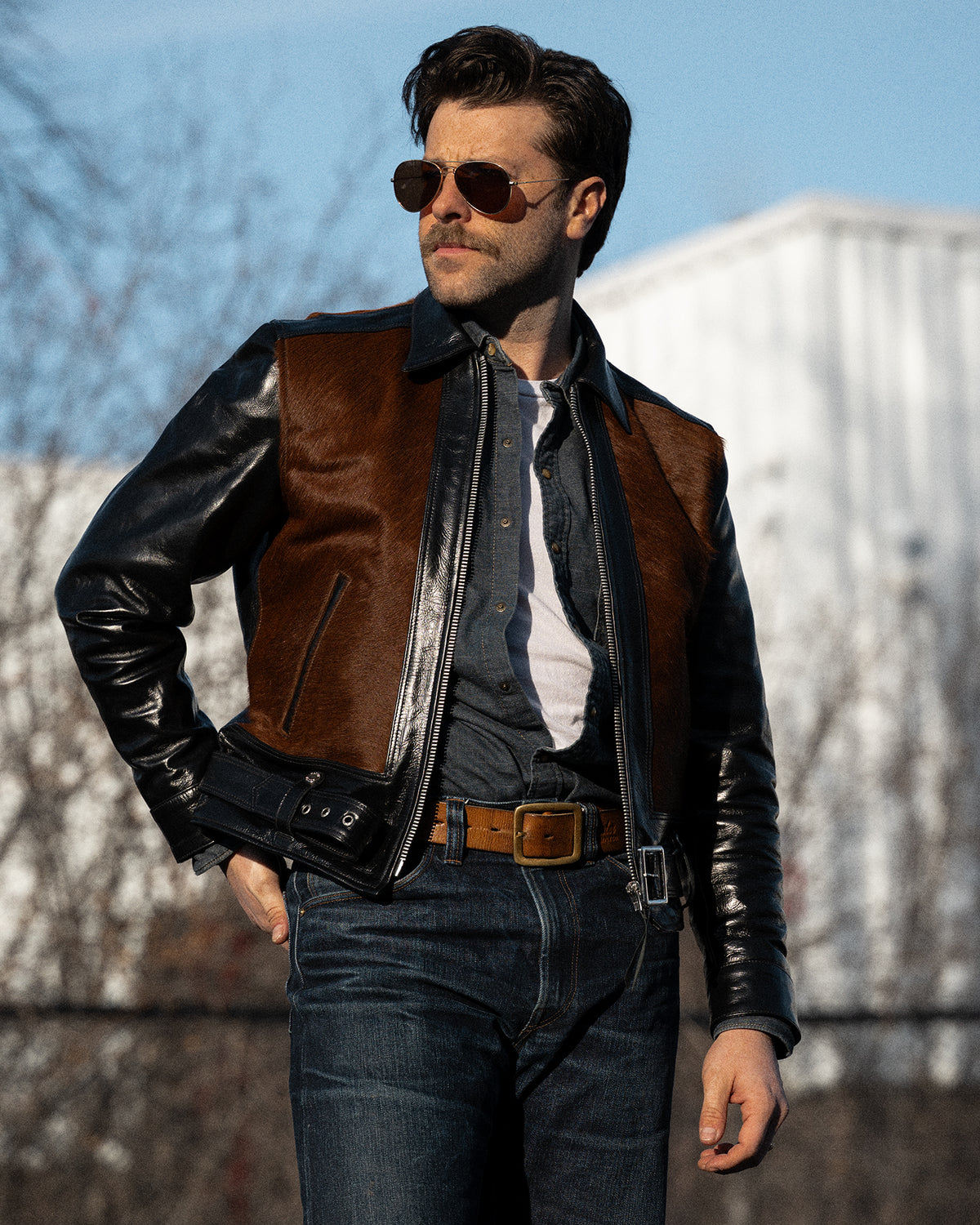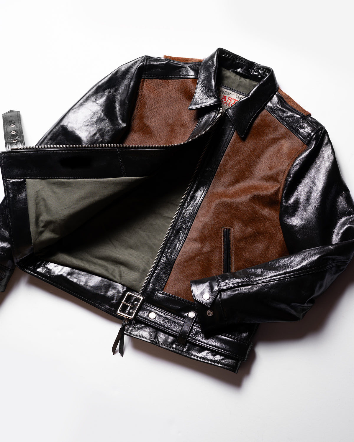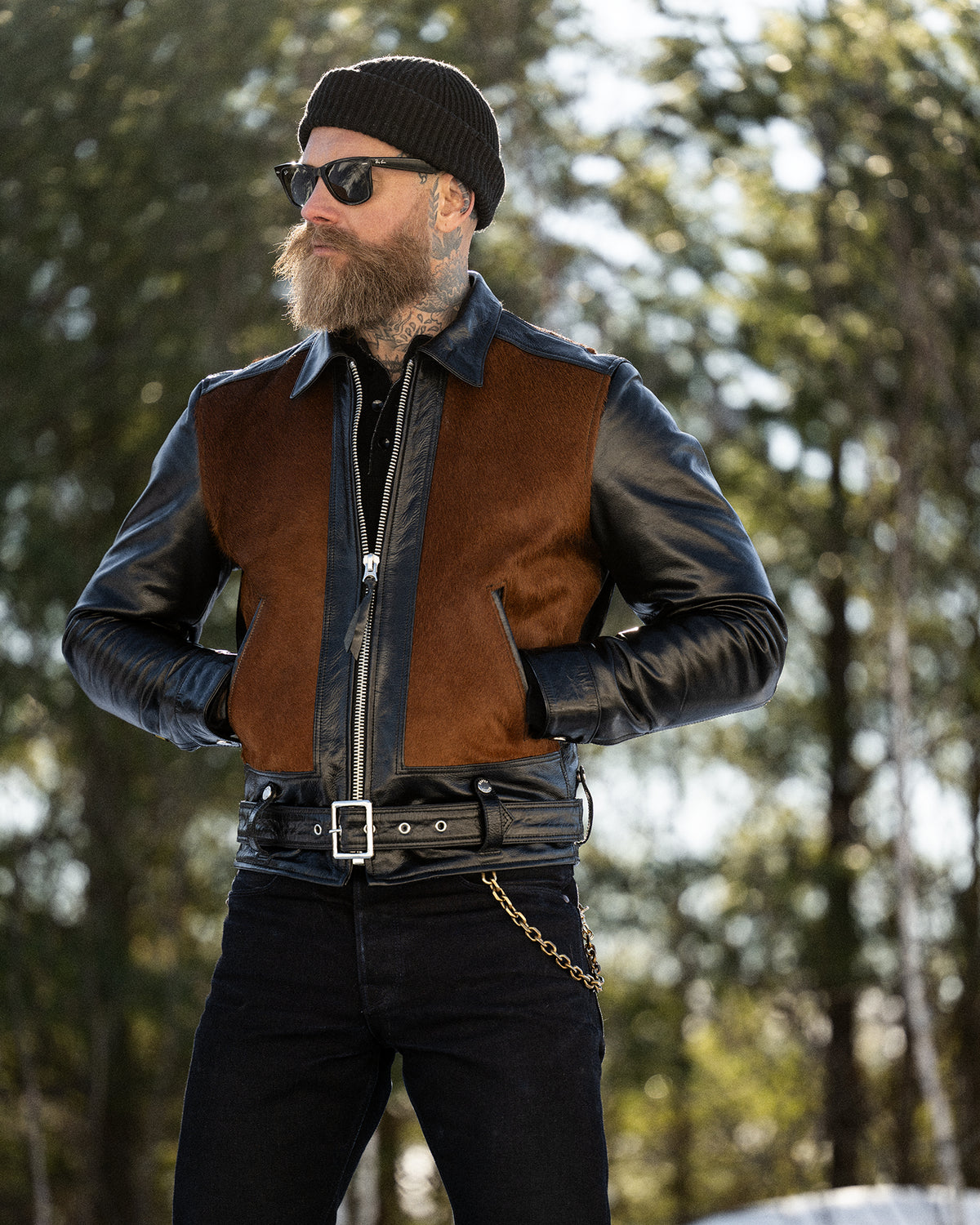 The shell is cut from 1.5 mm vegetable-tanned black cowhide, selected for its strength, structure, and ability to develop character with wear. The front and back panels feature genuine hair-on cowhide, creating natural contrast and texture against the smooth leather body. Each hide displays organic variation in tone and pattern, ranging from lighter caramel browns to deeper, richer shades. No two jackets are excactly identical, and these differences are an intentional part of the design and material authenticity.