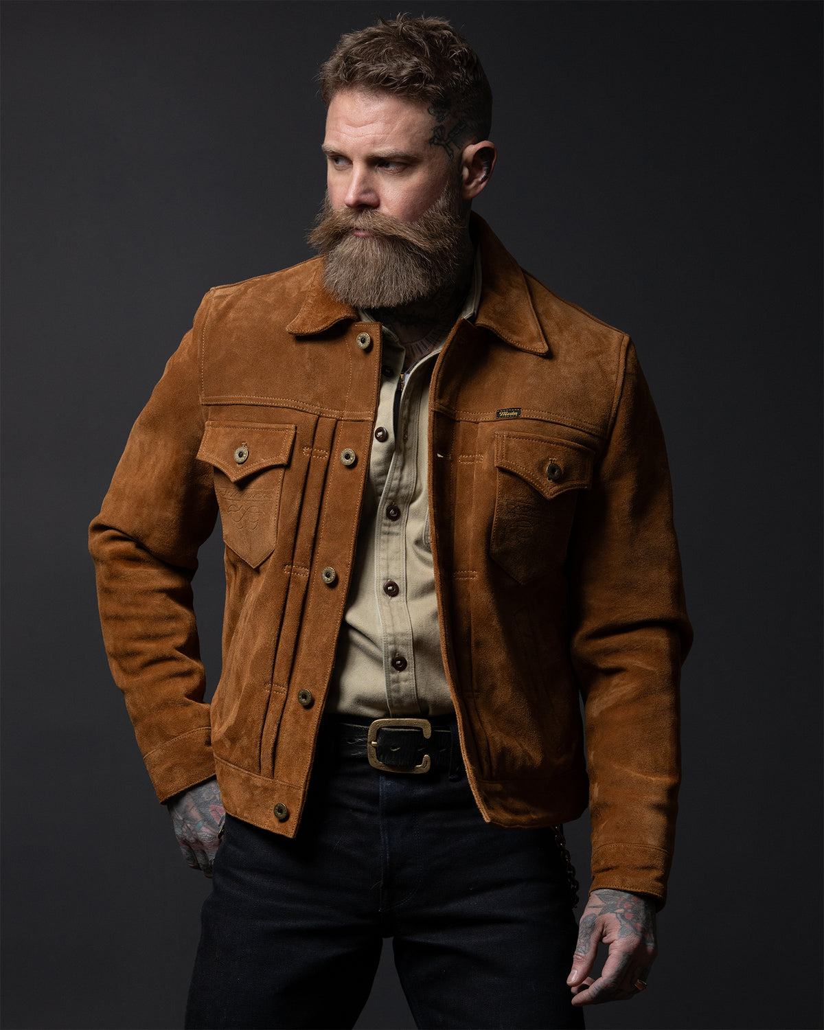 The Convoy: Tan is built from full-grain tan roughout cowhide with a warm, golden-brown tone that sits between tobacco and rawhide. The surface has a tight, even nap with subtle natural variation, giving the jacket a dry, workwear-driven character that will darken and smooth in high-wear areas over time.