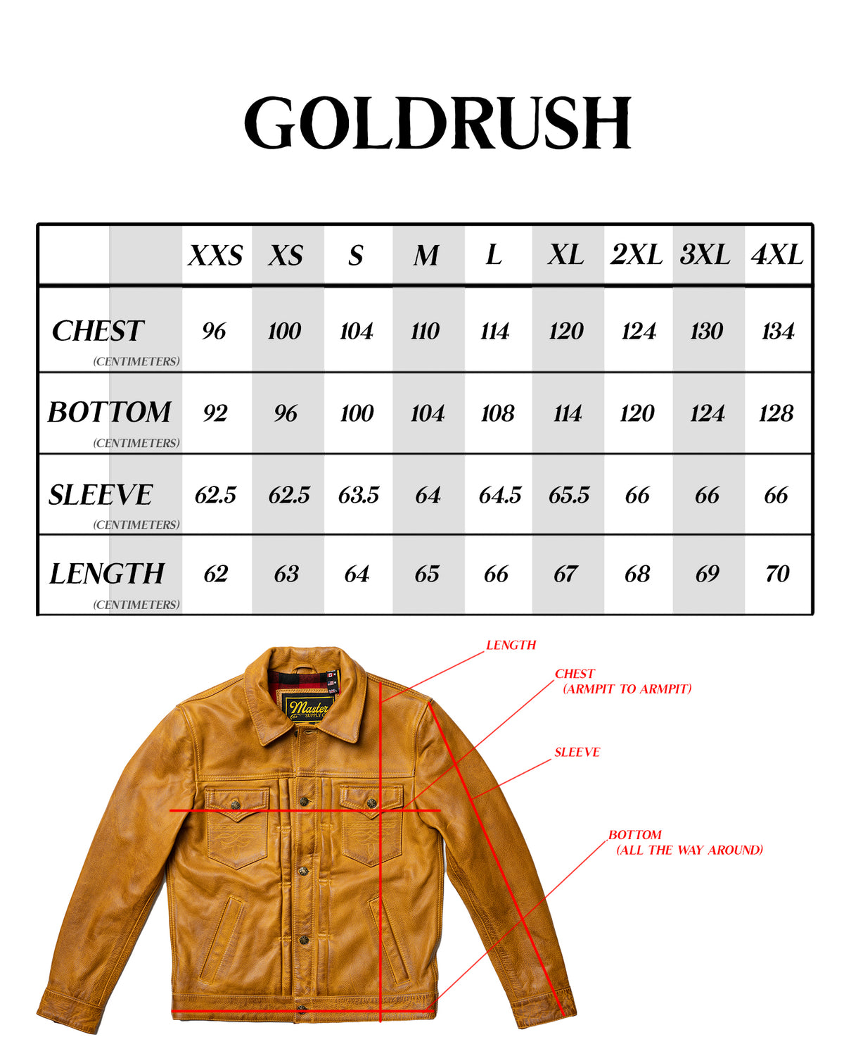 To maintain the quality of your Goldrush Leather Jacket, avoid excessive moisture. Clean with a damp cloth and use a leather conditioner periodically.