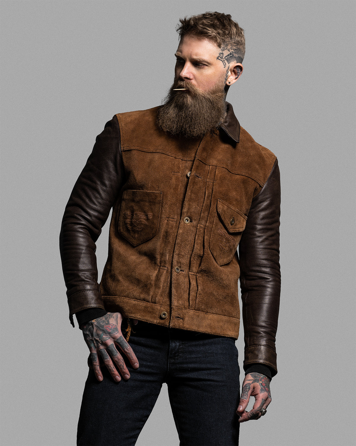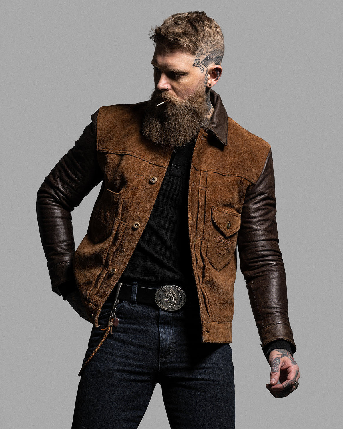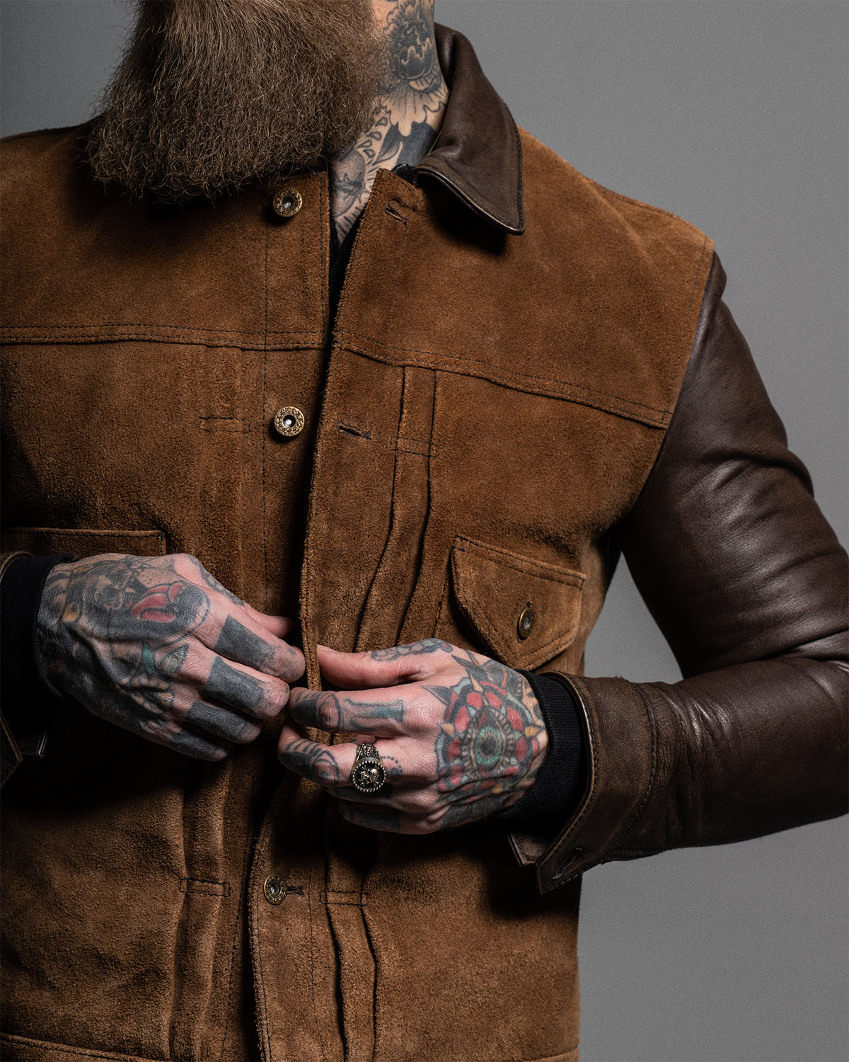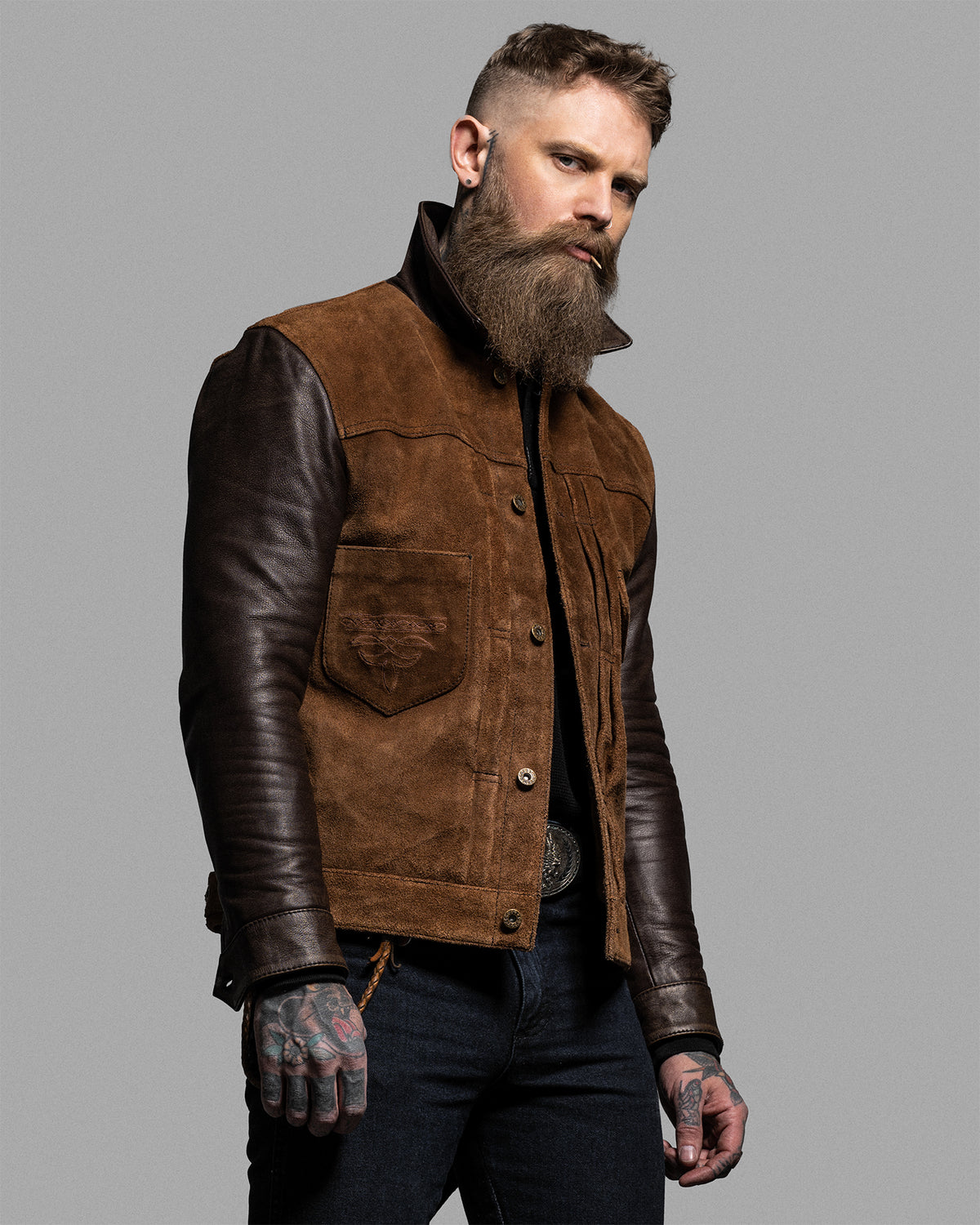 La chaqueta mantiene un estilo occidental con nuestros medallones de bolsillo característicos y la combinación de cuerpo de piel de vaca encerada con aceite y mangas y cuello de piel de vaca color óxido.